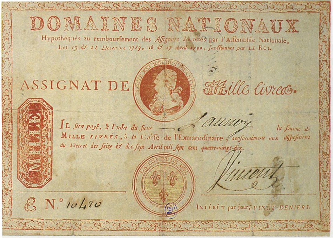 La Asamblea no tardó mucho en darse cuenta de que la venta de tierras de la iglesia no sería por sí sola la bonanza fiscal que había entrevisto. Para empezar, poner todas esas propiedades en el mercado disminuiría su precio de venta. Segundo, sencillamente no había suficiente capital flotante (es decir, metales preciosos) en Francia para hacer compras a gran escala. ¿Qué hacer? Era el momento del “último remedio” para la insolvencia fiscal: papel moneda fiduciario del gobierno. Aquí, la Guerra de Independencia Americana creó un pernicioso precedente. En marzo de 1790, la Asamblea autorizó la impresión de 400 millones de libras de assignats en papel con importes de 200, 300 y 1.000 libras, dando un 3% de interés y aceptados para el pago de impuestos y la compra de propiedades nacionales. En su apariencia, eran como los bonos del tesoro ingleses o las letras estadounidenses. Sus defensores argumentaban que los assignats proveerían los pagos a los acreedores del estado, proporcionarían un medio para que la gente comprara tierras y propiedades, sacarían de su escondite a los metales preciosos y estimularían el comercio y la industria.